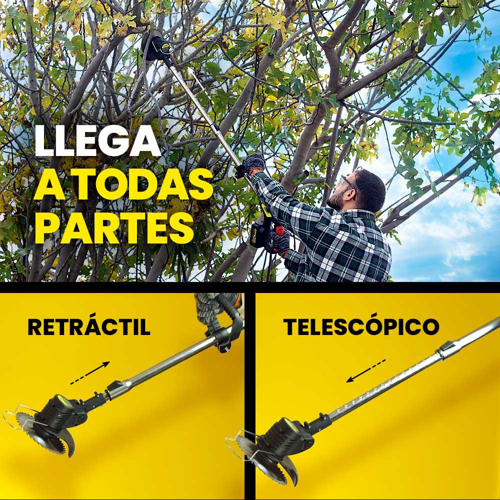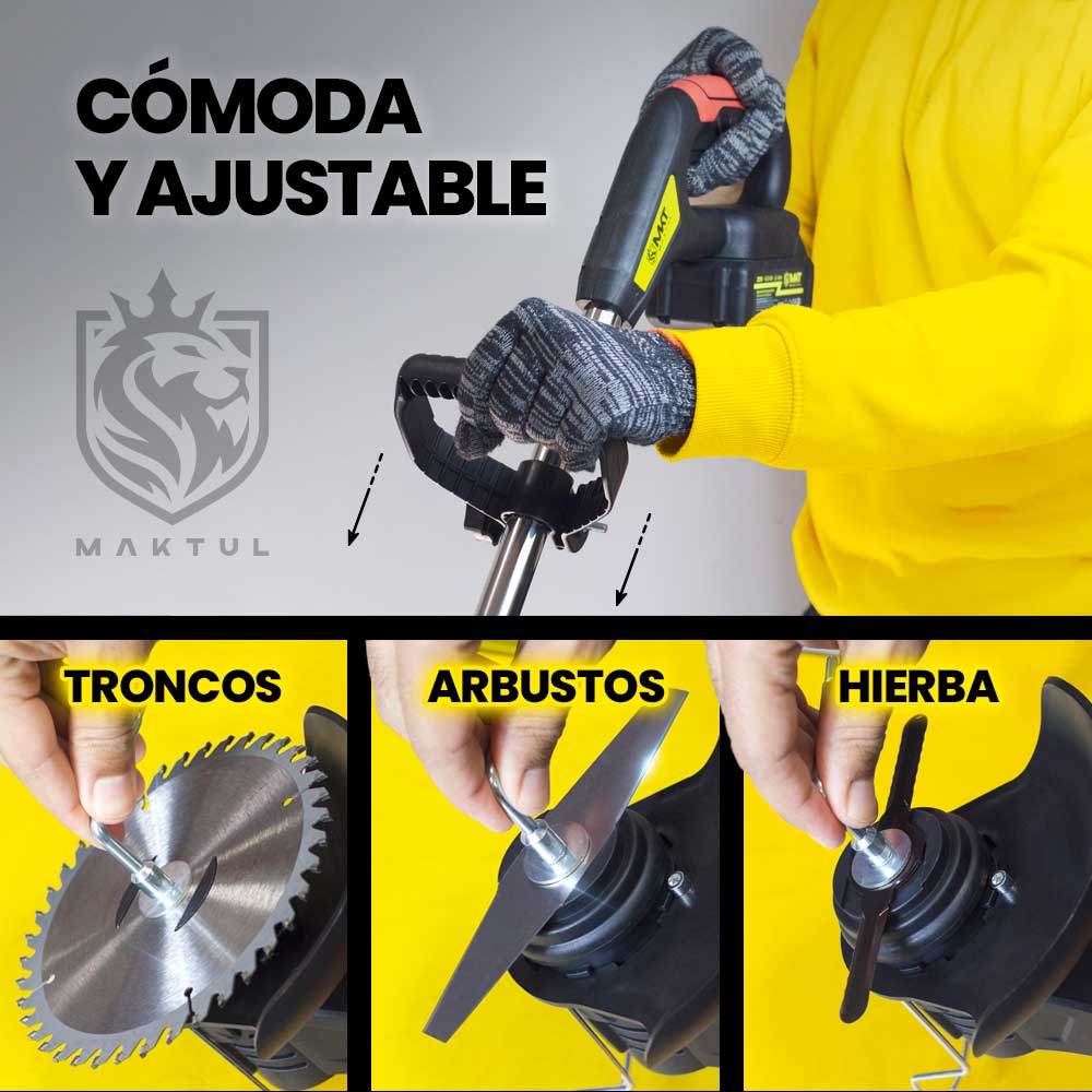 Esta desbrozadora eléctrica a batería MAKTUL es tu herramienta ideal multifunción 3 en 1 para cortar césped, bordes, arbustos y ramas altas, de forma fácil y rápida.